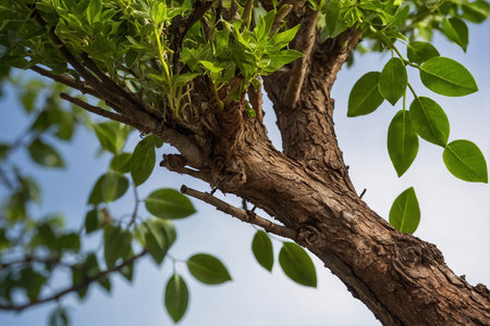 A striking perspective of a large tree captured from its base, showcasing the extensive network of branches and vibrant green leaves. The upward view reveals the tree's height against the sky, illuminated by sunlight. This image is suitable for various commercial uses, including environmental themes and nature-related content.