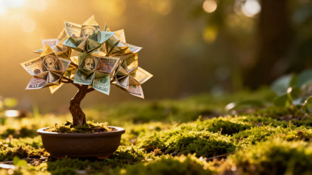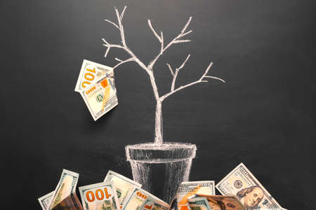 Money tree made by us dollar bills. Business, saving, growth, economic concept. Investors strategy, funding symbol. Copy space.