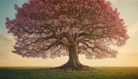 AI Generated. Lush Green Tree in Open Field Under Clear Blue Sky