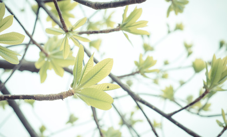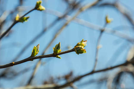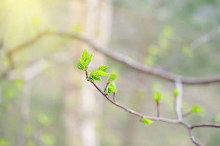 Spring background of the young green leaves of birch. The buds bloom in the spring. Copy space.