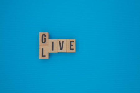 Title: Wooden cubes with the words GIVE and LIVE on smooth blue background