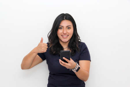 Young latin woman over isolated white background with cell phone in victory position shows happy and excited