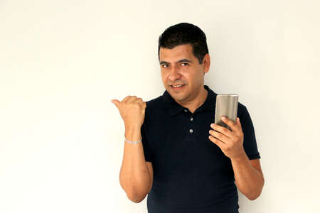 Adult latin man over isolated white background with cell phone in victory position shows happy and excited