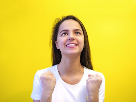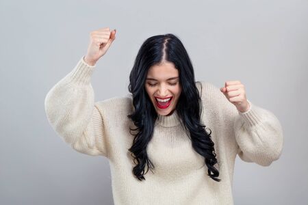 Young woman making a yay gesture on a gray background