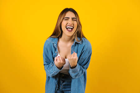 Excited agitated euphoric woman make win gesture