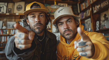 Two stylish men in caps giving thumbs up inside a vintage room filled with collectibles.