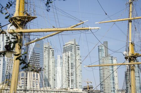 Puerto Madero, modern buildings seen through the masts and ropes of the ARA Presidente Sarmiento Frigate