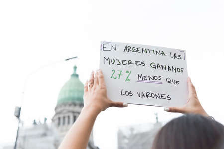 CABA, Buenos Aires / Argentina; March 9, 2020: international women's day. Hands holding a poster on labor inequality, in front of the National Congress: in Argentina, women earn 27% less than men.