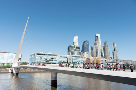 Buenos Aires, Argentina; Oct 31, 2019: Puerto Madero, an exclusive and touristic neighborhood with modern architecture, tall buildings and the Puente de la Mujer bridge, with many visitors crossing it