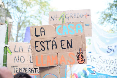 CABA, Buenos Aires, Argentina; Sept 24, 2021: Sign text: the house is on fire. Mass demonstration in the context of the Global Climate Strike.