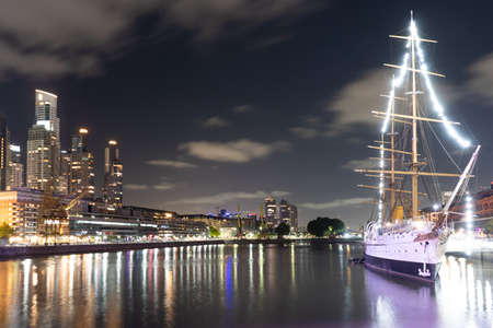 Night shot of the old boat at the harbor, with the city lights at Puerto Madero, Buenos Aires, Argentina.