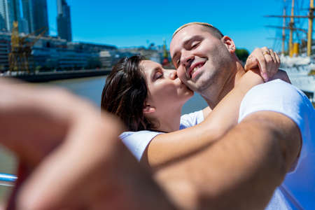 A beautiful young Latin couple taking a selfie. Concept of love, couple, happiness, technology.