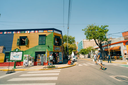 Typical brightly colored building on Caminito in La Boca witn tourists, Buenos Aires, Argentina - Dec 2th 2023. High quality photo