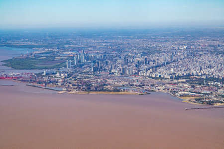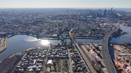 Aerial view of the La Boca neighborhood in Buenos Aires. The city of Buenos Aires can be seen in the background.