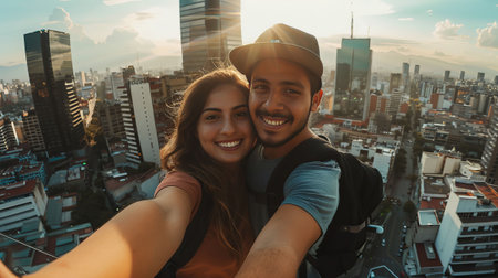 Happy couple selfies in Mexico City, backpacks on, smiling. Skyscrapers and architecture glow in the background.