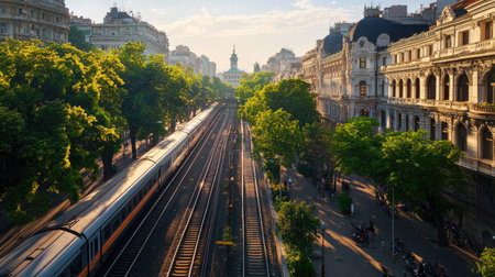 A breathtaking aerial view of a vibrant urban landscape showcasing train tracks flanked by lush green trees, historic architecture, and glowing sunset light.