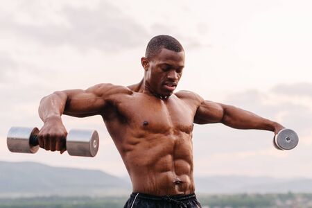 Portrait of black african american muscular man lifting dumbbells against the sunset sky background.