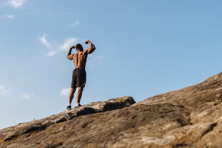 Back view of handsome african american bodybuilder posing on rock against the blue cloudy sky.