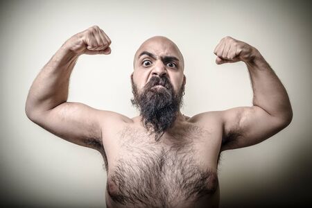 A bearded man flexes his bicep against a white backdrop. His determined expression and strong arm convey power and confidence.