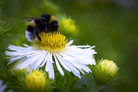 bumblebee pollinating white flowers macro