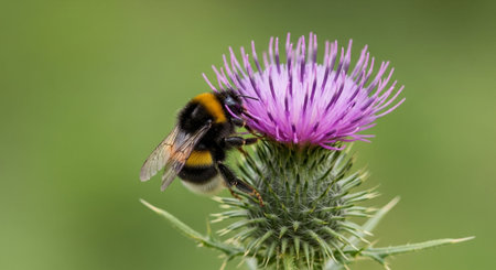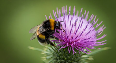 Bumblebee collecting nectar from a thistle flower in the field