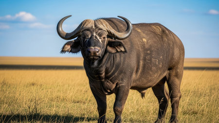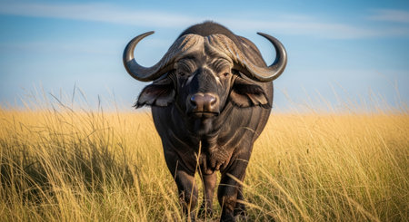 Powerful african cape buffalo stands in golden savanna grass, looking directly at the viewer. large dark skinned animal with massive horns under a clear blue sky, embodying strength and wilderness.