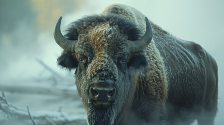 Bison in the meadow at sunrise. Bison in the fog.