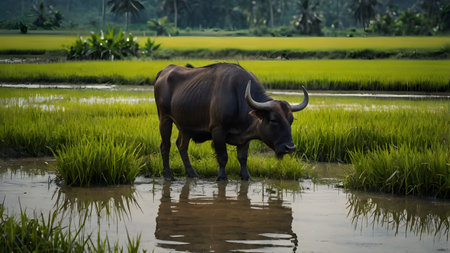 water buffalo in rice field in india