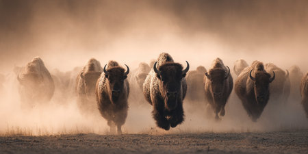 A herd of bison is running through a dusty environment. The animals are brown, with curved horns and a shaggy appearance. The composition shows the animals moving towards the viewer. The scene suggests an outdoor environment with warm sunlight. The image could be used for editorial purposes or commercial projects.