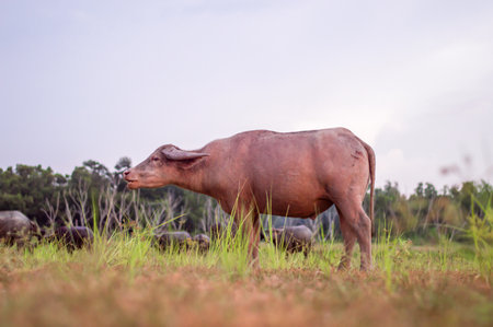 Buffalo running in the grassland during sunset time, Thailand.
