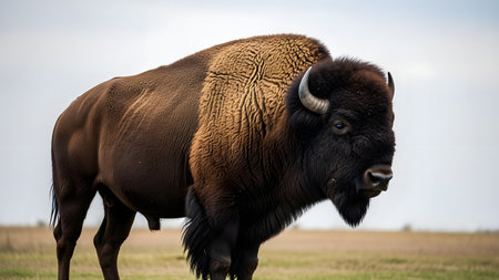 A majestic American bison stands in profile in a grassy field, showcasing its thick brown fur and curved horns. The background is desaturated to highlight the powerful presence and rugged beauty of the wild animal.