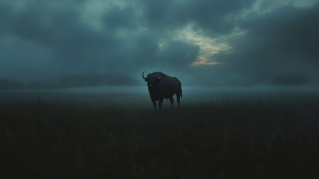 A solitary bull stands against a backdrop of mist and fading light, creating a dramatic and serene atmosphere in a fog-covered field.