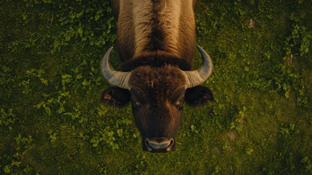Closeup head of one plains bison outdoor. Herd animal buffalo ox bull staring looking down on meadow in prairie. Wildlife beauty in nature. Wild species in natural habitat.