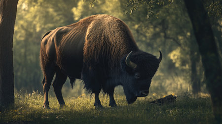 A large bison is the focal point of this image, standing in a field. The scene captures a natural environment with trees in the background, under overcast lighting. The composition is suitable for various commercial uses, including illustrations and editorial content, and it evokes a sense of wildlife.