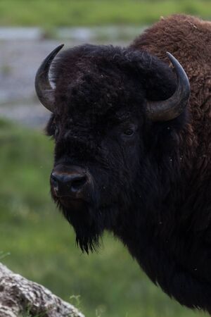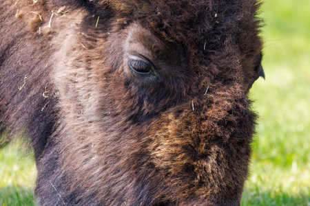 Close up of American bison, also known as buffalo, grazing in a grass field in Yellowstone National Park during spring.