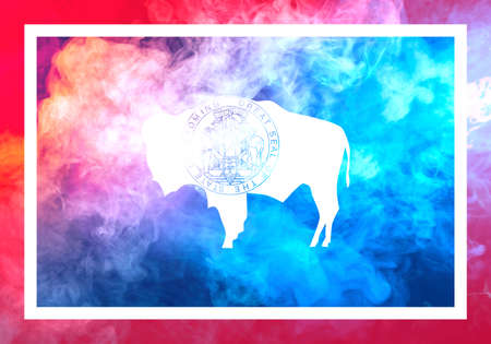 The national flag of the US state Wyoming in against a gray smoke on the day of independence in different colors of blue red and yellow. Political and religious disputes, customs and delivery.