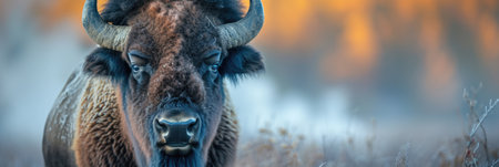 Aggressive wild bison with horns ready to charge creating a dangerous situation for onlookers. Concept Wildlife encounter, Bison behavior, Animal safety, Potential danger, Wildlife photography