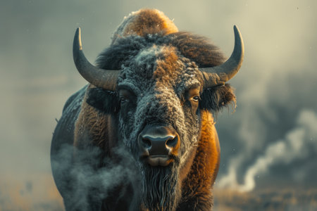 A bull is standing in a cloud of dust with horns, AI