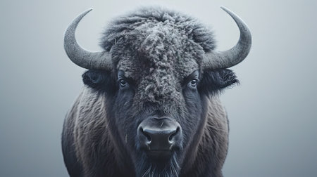 Portrait of a big bison with big horns on gray background