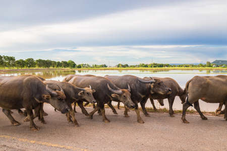 Thai buffaloes walking on the road in countryside of Thailand