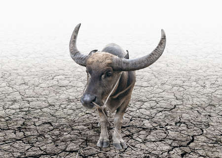 Buffalo tether and stand alone on the cracked soil ground