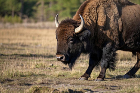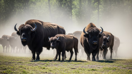A group of bison are presented in a natural environment, appearing majestic. The scene shows a herd of brown, furry animals in a field, with a forest in the background. The lighting is bright and the composition is horizontal. This image may be suitable for use in educational materials or wildlife-related projects.