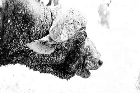 Black and white first plane scene of an african buffalo.