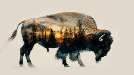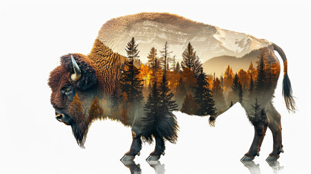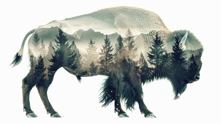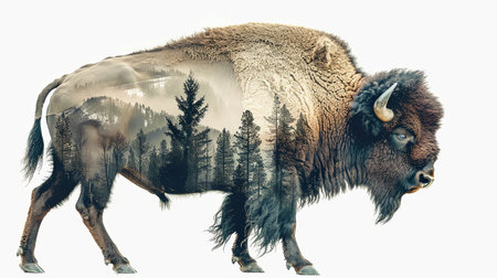 Graphic illustration of bison on a white background double exposure overlay with mountain landscape and forest isolated.