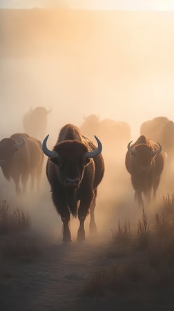 A stunning image of a herd of bison charging through a foggy landscape, showcasing their strength and majesty in a captivating natural setting.