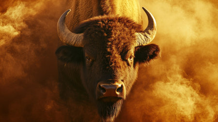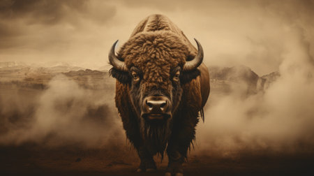 A striking image of a majestic bison galloping through a dusty prairie, showcasing the raw power and beauty of wildlife in a dramatic low light setting.