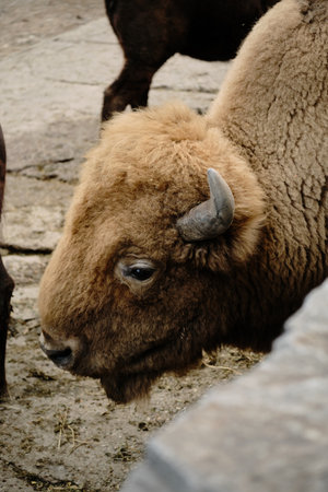 Close view of a European bison head with short horn and woolly fur, feeding in Belgrade Zoo