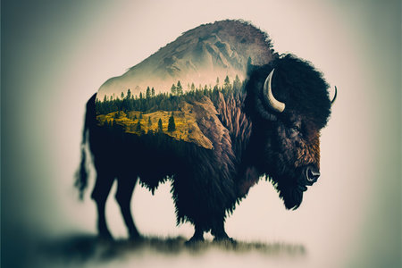 American male bison grazing on grassland with double exposure background of natural scenery in yellowstone. Large mammal body with fur and horn. Superb Generative AI.