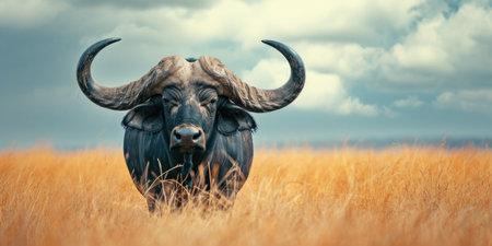 Cape Buffalo Standing in Golden Grass with Dramatic Sky