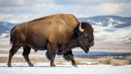A large brown bison walks on snowy ground with its head down, set against a backdrop of snow-covered mountains and a cloudy sky.